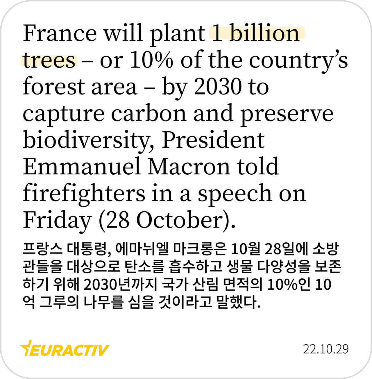 나무는 광합성 작용을 하면서 대기 중의 이산화탄소를 흡수하고 산소를 공급합니다. 기후 변화에 대응하고 탄소 중립을 실현하기 위해 온실가스 감축이 반드시 필요한 상황에서 나무는 가장 효과적이며 효율적인 탄소흡수원으로 각광받고 있습니다.