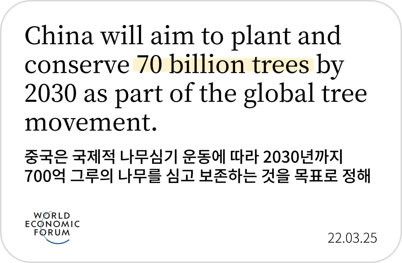 숲은 이산화탄소를 흡수할 뿐 아니라 동물이 살아가는 터전입니다. 물을 정화하고 토양의 질을 높이고 숲에 있는 것만으로 마음을 편안하게 해줍니다. 하지만 기후 변화에 의해 몽골은 전체 국토의 76.9%가 사막화 진행 중에 있으며 또 무분별한 개발과 벌채로 인해 2018년 기준 브라질의 아마존 산림의 38%가 파괴되었습니다. 불법적인 벌채로 인해 아마존 산림이 저장하고 있던 대량의 온실가스가 대기 중으로 방출되고 있으며 심각한 글로벌 환경 위기를 가속화하고 있습니다.